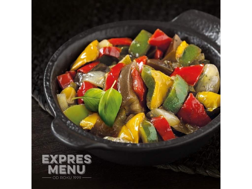 Tradiční francouzské lehké zeleninové jídlo z cuket, lilku, paprik, rajčat a cibule, dušené na olivovém oleji.