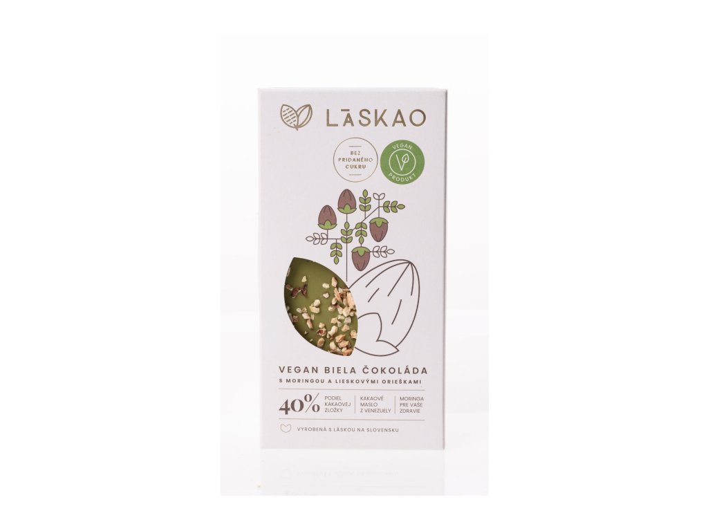 Čokoláda bílá s moringou a lískovými ořechy - VEGAN - LÁSKAO 75g