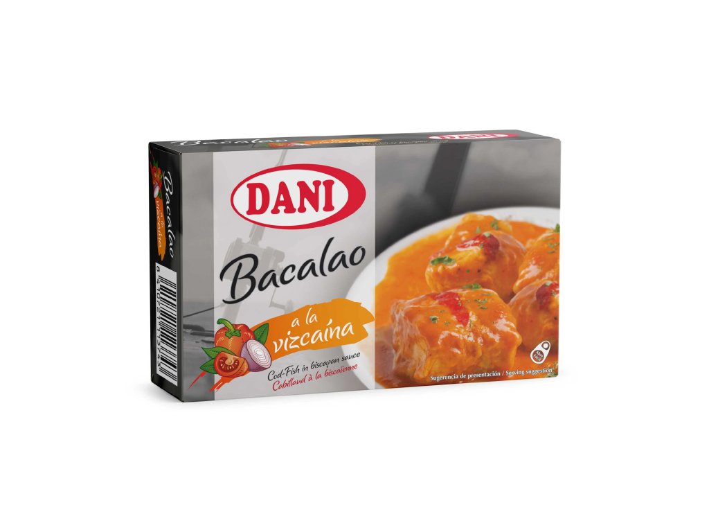 Treska v omáčce. Složení: treska , slunečnicový olej, rajčata, cibule, koření, sůl. Hmotnost 106g, hmotnost pevného podílu 70g. Minimální trvanlivost do data uvedeného na obalu. Může obsahovat stopy měkýsů a korýšů.