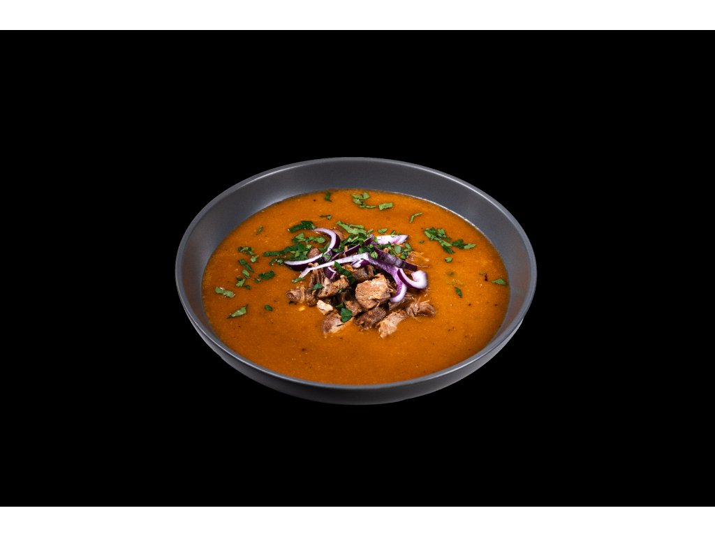 Složení v okamžiku zpracování: krůtí maso (30%), vývar (mrkev, celer, cibule, pepř, česnek, sůl, libeček, kuř. skelet, vepř. kosti, hov. ořez), rýžová mouka, sádlo, uzená slanina, rajský protlak (voda, rajče, cukr, m. škrob), paprika, kmín. Může obsahovat stopy lepku.