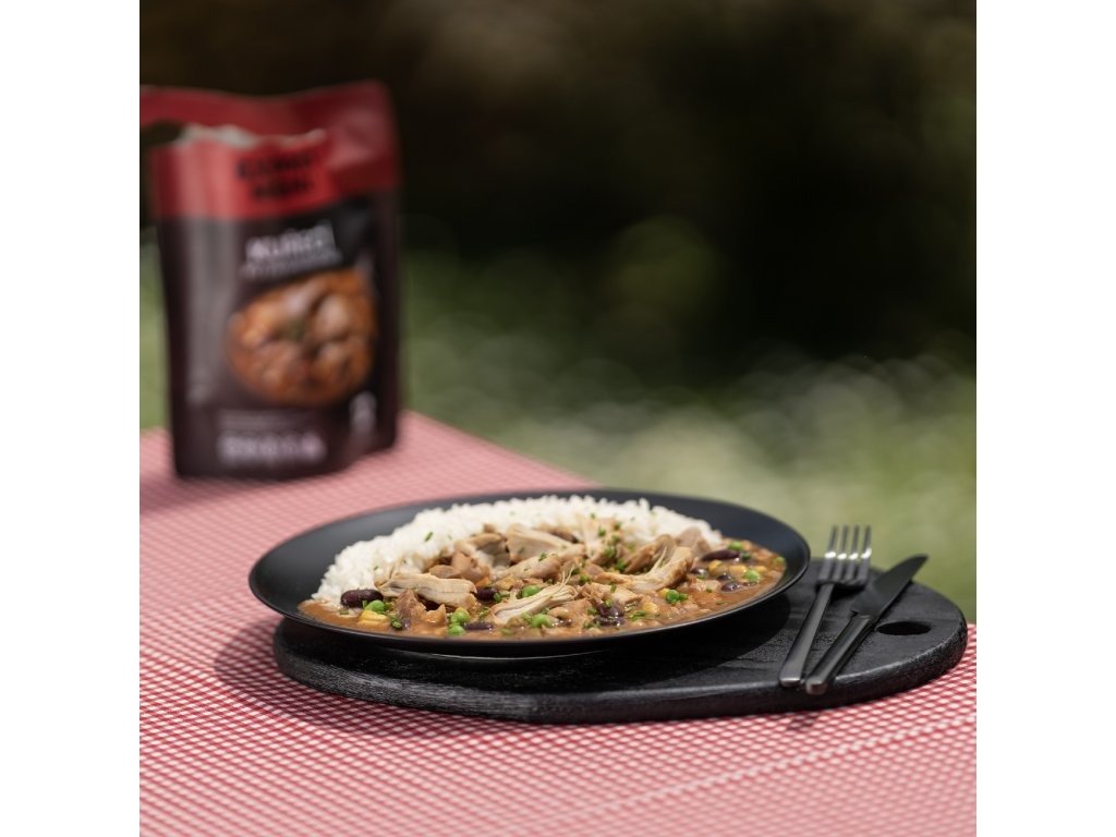 Šťavnaté kousky kuřecího masa v jemné zeleninové směsi z červených a bílých fazolí, mrkve a kukuřice.