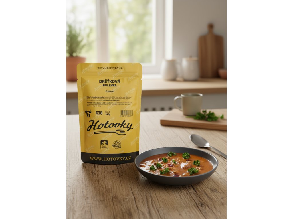 Polévky Dršťková polévka Poctivá dršťková z hovězích drštěk s chutí papriky, kmínu, česneku a majoránky. Klasika, která zahřeje. Tip k servírování Podávejte s čerstvým chlebem nebo pečivem. Skvěle chutná i s kapkou chilli oleje pro ostřejší verzi. Dršťková polévka – složení Co najdete v jedné poctivé porci Složení v okamžiku zpracování: hovězí dršťky (35 %), vývar (mrkev, celer, cibule, pepř, česnek, sůl, libeček, kuřecí skelet, vepřové kosti, hovězí ořez), rýžová mouka, sádlo, paprika, kmín, majoránka, směs koření. Může obsahovat stopy lepku.