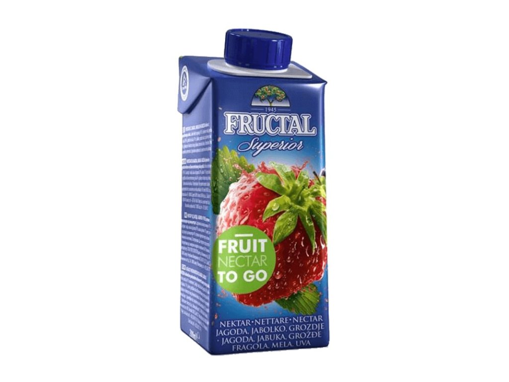 NEKTAR Z JAHOD, JABLEK A HROZNŮ Ovocný nektar je pasterizovaný osvěžující nápoj s podílem ovocné složky nejméně 45%. Tyto vitamíny v tekuté formě jsou vhodné ke každodenní konzumaci, jako součást jídel, očistných kůr, nápoj je prima osvěžujícím společníkem nejen doma, ale i v práci a na cestách. Složení: voda, jahodové pyré 30%, jablečné pyré 11%, cukr, hroznová šťáva z koncentrátu 4%, glukózo-fruktózový sirup, kyselina (kyselina citrónová) Použití: Před použitím nápoj protřepat. Nápoj je osvěžující, vhodný nejen na doma, ale také na cesty, výlety nebo do práce. Nabídka ovocných nektarů obsahuje černý rybíz, pomeranč , jablko , broskev s jablkem a jahodu. Skladování: Otevřený nápoj uchovávejte v chladničce a spoptřebujte do tří dnů. Objem: 200ml FRUCTAL je slovinská společnost, jejíž počátky se datují od roku 1974 a která je výrobcem široké škály ovocných produktů. Výrobce: FRUCTAL Živilska industrija d.o.o.. Tovarniška cesta 7, 5270 Ajdovščina, SlovinskoDoplňkové parametry
