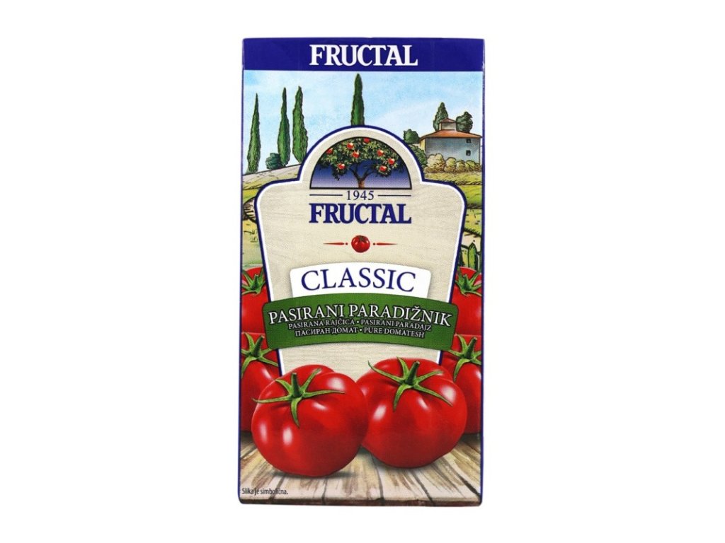 PASÍROVANÁ RAJČATA Pasírovaná rajčata jsou rajčatový protlak vyrobený z čerstvých rajčat. Nejlepší, opatrně vybraná rajčata jsou sklízena v jejich optimální vyzrálosti, kdy je zachována šťavnatost a plná chuť. Složení: rajčatové pyré 97,7%, voda, cukr, jodizovaná sůl, kyseliny (kyselina citronová) Použití: Před otevřením vždy protřepte. Protlak lze použít k výrobě konkrétních pokrmů nebo jej lze použít jako přídatnou ingredienci. Skladování: Nevystavujte přímému slunečnímu záření. Otevřený výrobek uchovávejte v chladničce a spotřebujte do 4 dnů. Objem : 500ml FRUCTAL je slovinská společnost, jejíž počátky se datují od roku 1974 a která je výrobcem široké škály ovocných produktů. Výrobce: FRUCTAL Živilska industrija d.o.o.. Tovarniška cesta 7, 5270 Ajdovščina, SlovinskoDoplňkové parametry