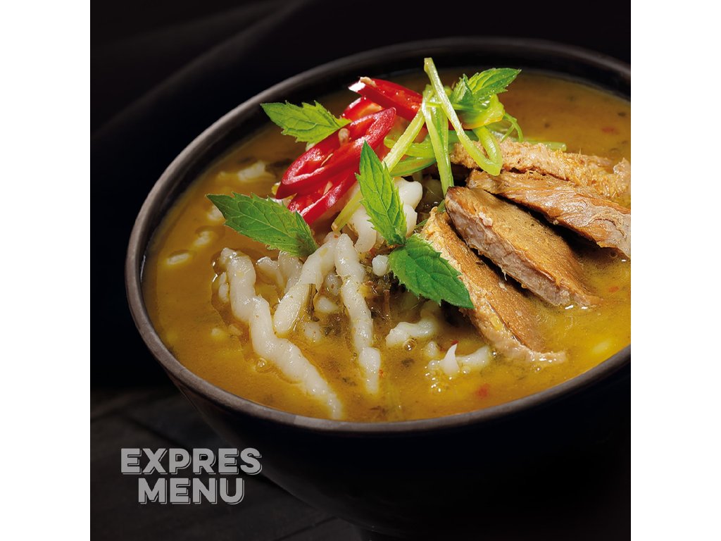Plátky kachního masa v kokosové omáčce s červenou kari pastou, citronovou trávou a limetkou. Výrazná chuť s pikantním nádechem.
