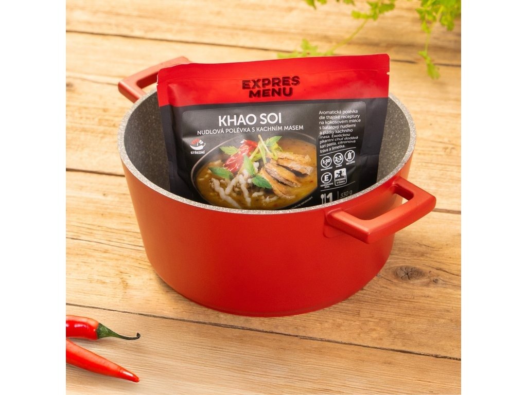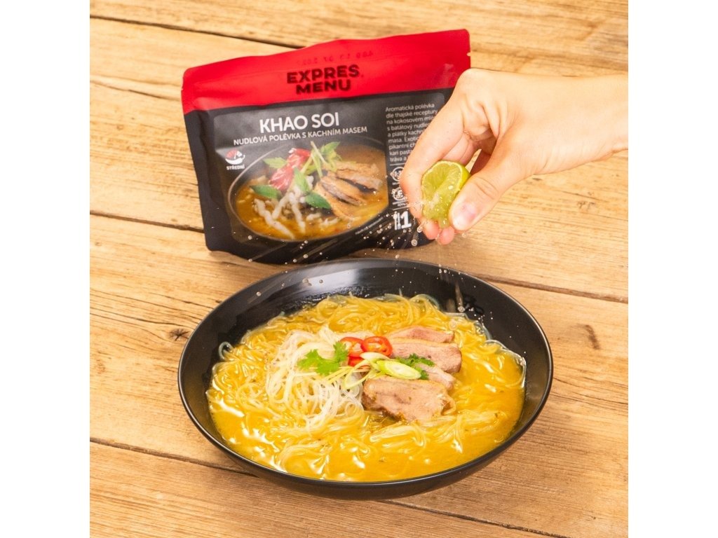 Složení: Kachní prsa s kůží (19,7 %), kokosové mléko (19,2 %) (kokos, pitná voda), batátové nudle (6 %) (škrob z batát, pitná voda), limetková šťáva (2,6 %), rybí omáčka (2,4 %) (extrakt ze sardele obecné 63 %, pitná voda, jedlá sůl, cukr), kuřecí vývar (kuřecí kosti, pitná voda), třtinový cukr, citronová tráva (1,6 %), koriandr listy, červená kari pasta (0,2 %) (sušené červené chilli 28 %, citronová tráva, česnek, jedlá sůl, šalotka, kaffir, galgán, koriandr, římský kmín), mletý koriandr, římský kmín, chilli, kurkuma, kafírové lístky.