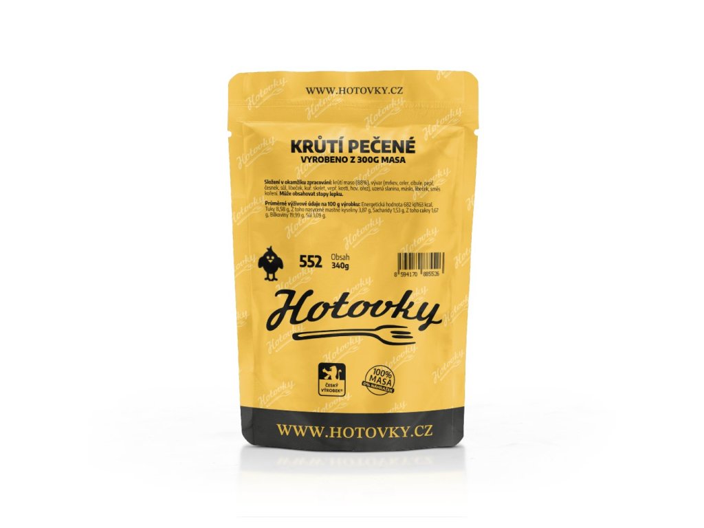Složení v okamžiku zpracování: krůtí maso (88%), vývar (mrkev, celer, cibule, pepř, česnek, sůl, libeček, kuř. skelet, vepř. kosti, hov. ořez), uzená slanina, máslo, libeček, směs koření. Může obsahovat stopy lepku.