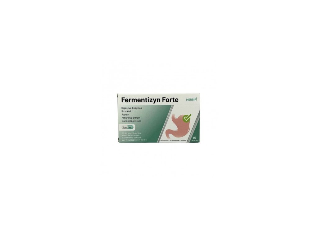 Doplněk stravy Fermentizyn obsahuje rostlinné štěpící enzymy. Papája s obsahem papainu, ananasem obsahující bromelain a artyčok podporují trávení. Složení 1 tobolky: papája, extrakt z plodu 100 mg, v tom papain 5 000 U; ananas, extrakt z plodu 100 mg, v tom bromelain 10 GDU ; artyčok zeleninový, extrakt z listu 50 mg; smetanka lékařská, extrakt z kořene 50 mg, protispékavá látka: hořečnaté soli mastných kyselin. Obal tobolky: želatina. Doporučené dávkování: 1 – 2 tobolky denně zapít vodou. Upozornění: Není určeno pro děti do 14 let , těhotné a kojící ženy . Nepřekračujte doporučené dávkování. Výrobek není určen k používání jako náhrada pestré a vyvážené stravy a zdravého životního stylu. Nedoporučuje se při individuální nesnášenlivosti některé složky přípravku. Skladování: Ukládejte mimo dosah dětí! Uchovávejte na tmavém místě při teplotě 5 - 25 0 C. Minimální trvanlivost do/Šarže: na boční straně obalu Země původu : Polsko Distributor pro ČR : TML a.s., Zábrdovická 25/2, 615 00 Brno-Zábrdovice, info@tml.cz Balení: 15 tobolek Z DŮVODU NAŘÍZENÍ KOMISE (EU) Č. 1924/2006 O VÝŽIVOVÝCH A ZDRAVOTNÍCH TVRZENÍCH PŘI OZNAČOVÁNÍ POTRAVIN NEMŮŽEME O TOMTO VÝROBKU UVÉST VÍCE INFORMACÍ.Doplňkové parametry