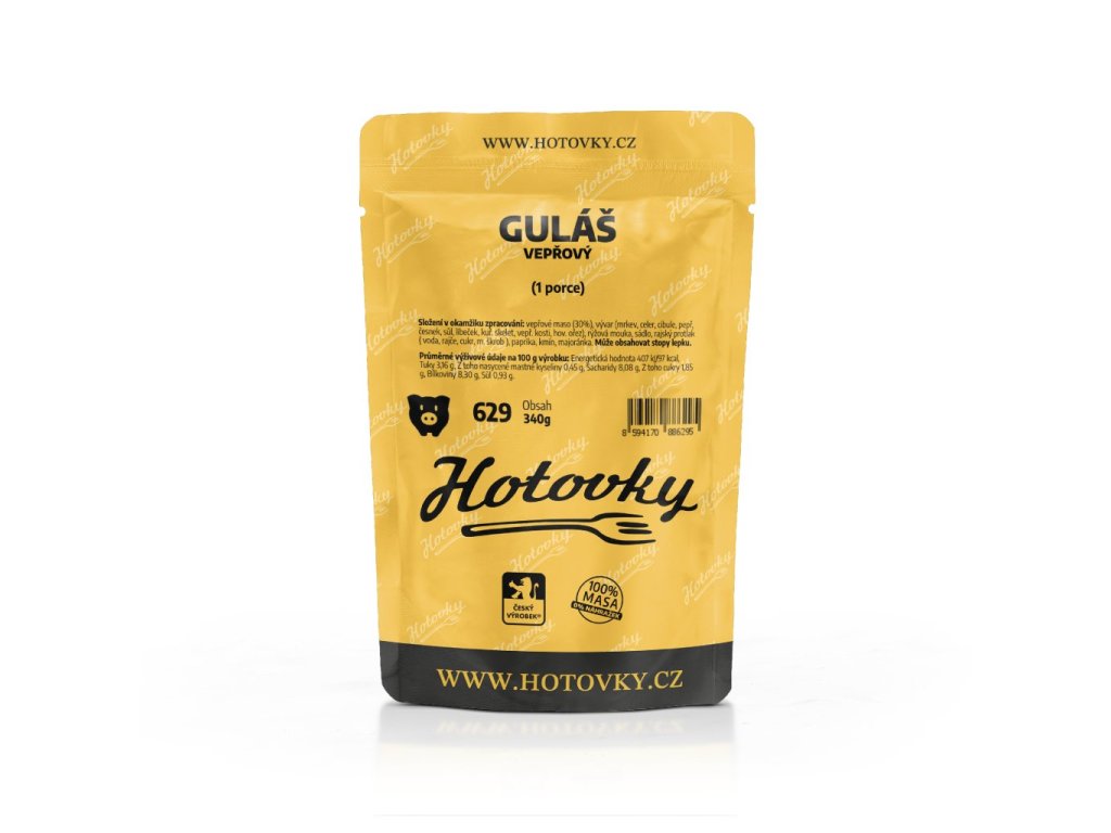 Složení v okamžiku zpracování: vepřové maso (30%), vývar (mrkev, celer, cibule, pepř, česnek, sůl, libeček, kuř. skelet, vepř. kosti, hov. ořez), rýžová mouka, sádlo, rajský protlak ( voda, rajče, cukr, m. škrob ), paprika, kmín, majoránka. Může obsahovat stopy lepku.